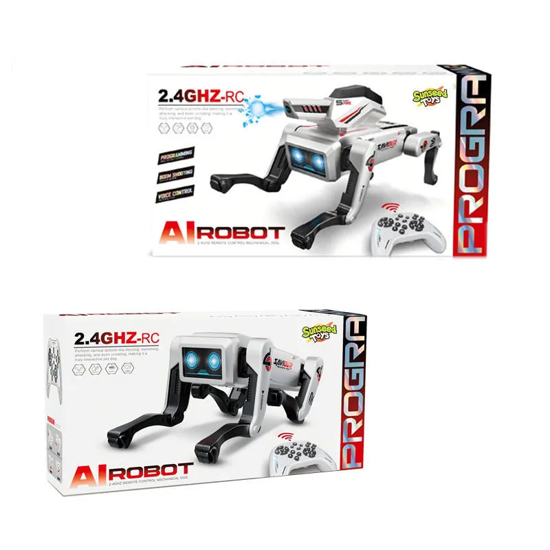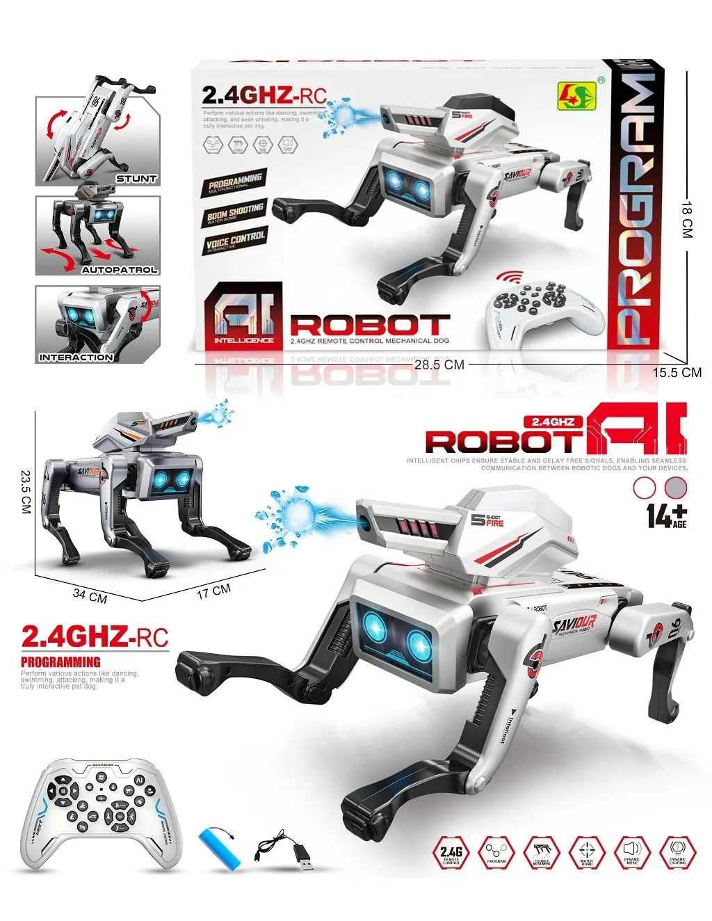 All-Function Interactive RC Smart AI Robot Dog is a fun and educational electronic toy with light, sound, and shooter remote—perfect Christmas gift for kids.