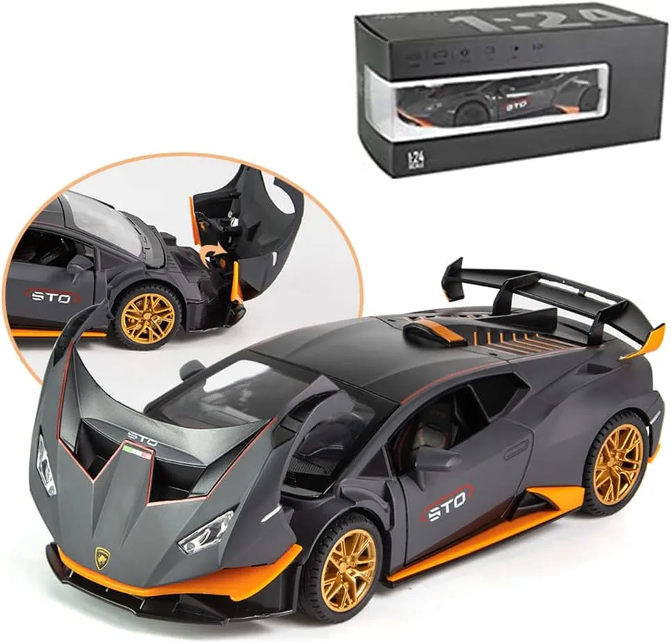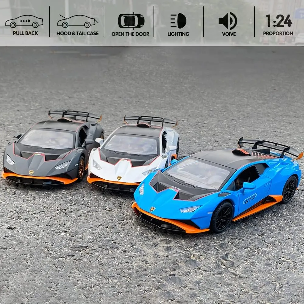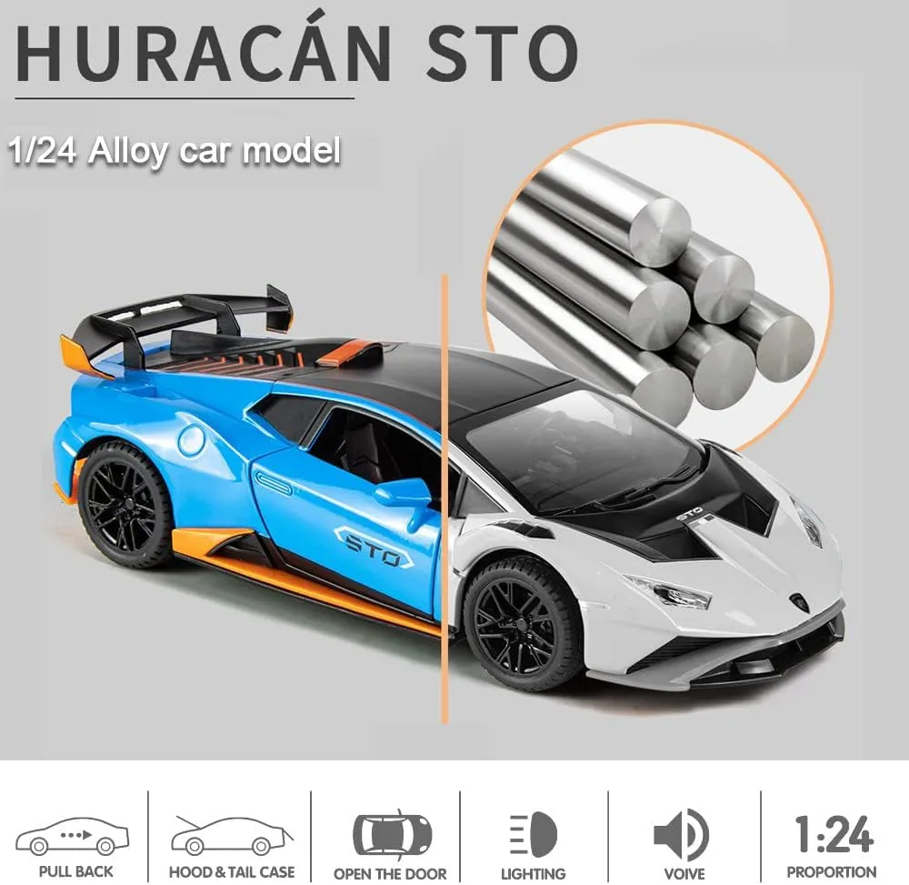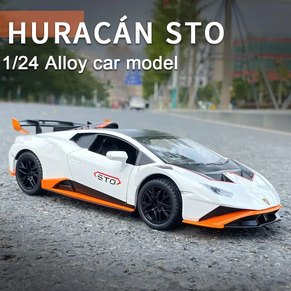 Premium 1:24 scale Lamborghini Huracan STO alloy diecast car—pull-back action, sound & light effects, perfect for kids and adult collectors.