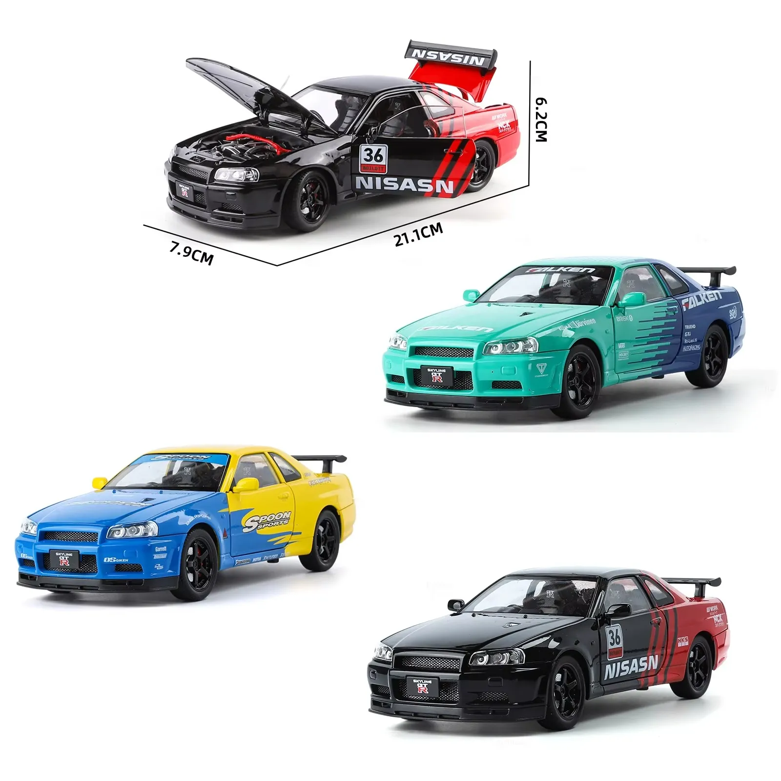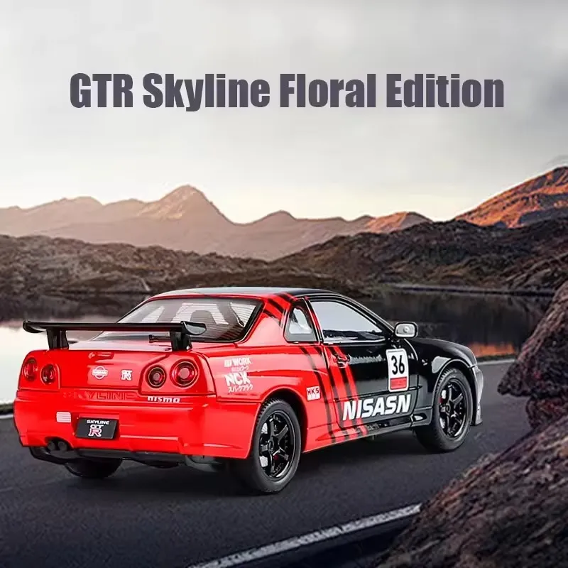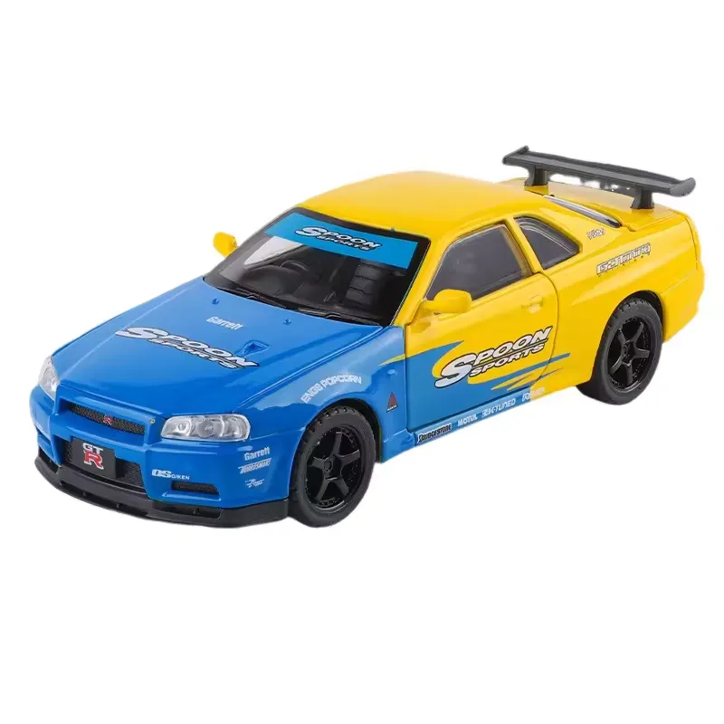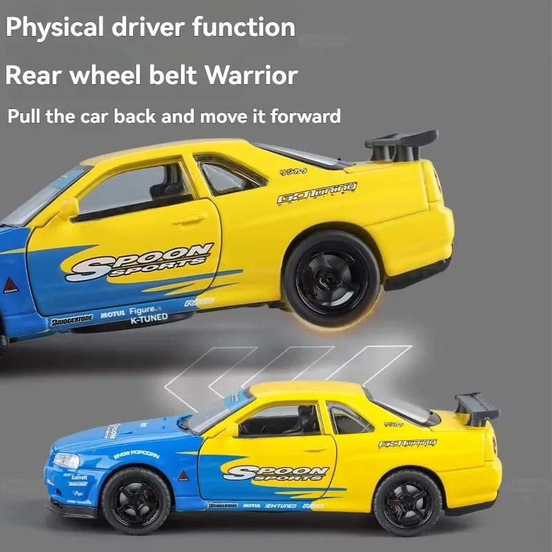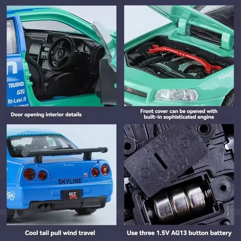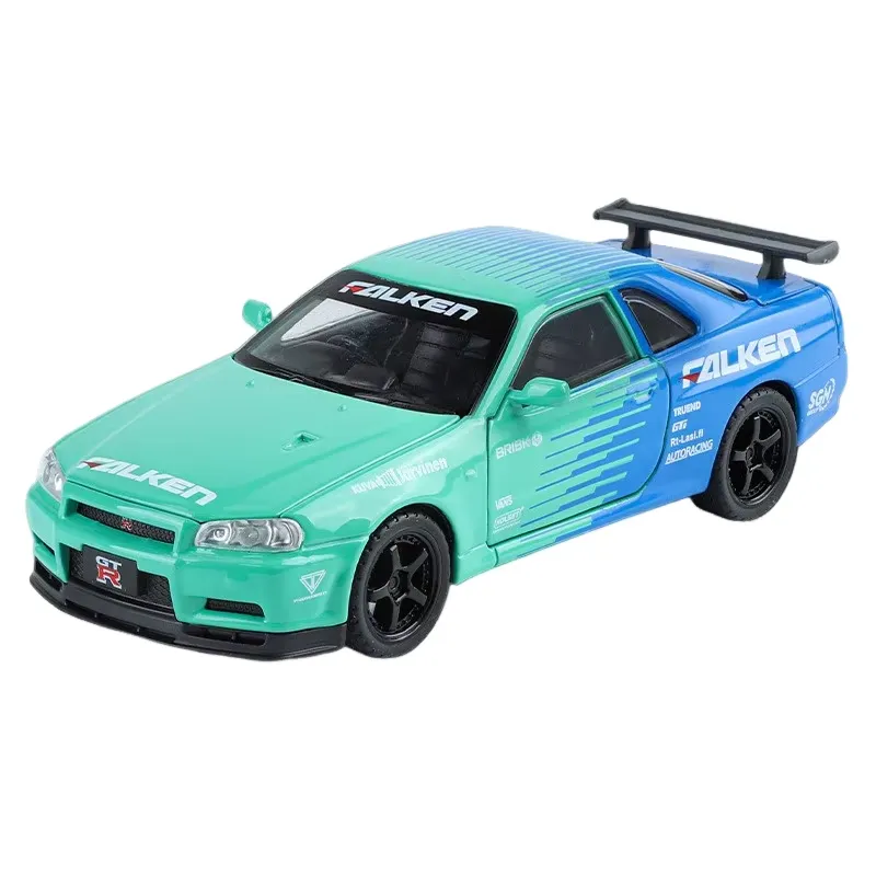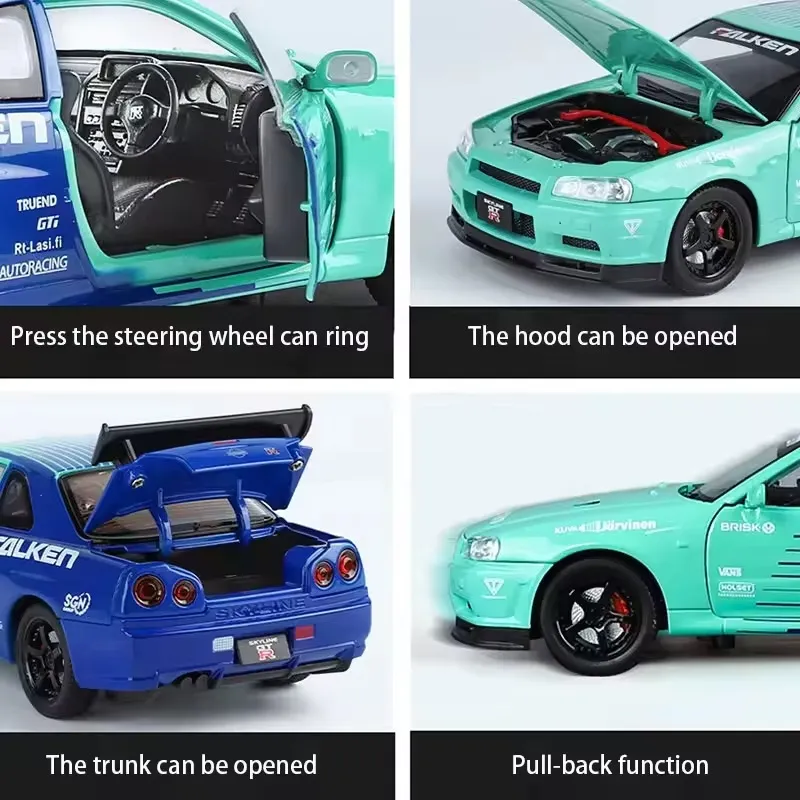Nissan GTR R34 diecast car, 1:24 alloy model car, Skyline R34 toy car, metal racing car model, pullback car with light and sound, collectible sports car model, die-cast toy car for kids, Nissan GTR model toy.