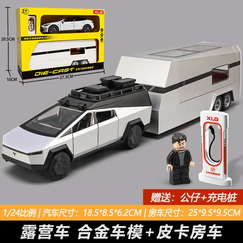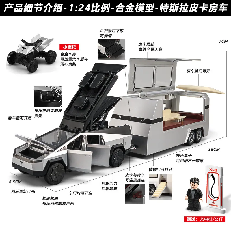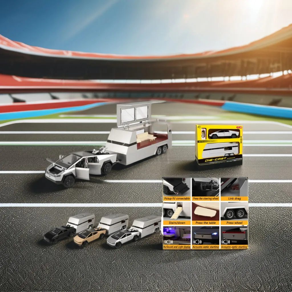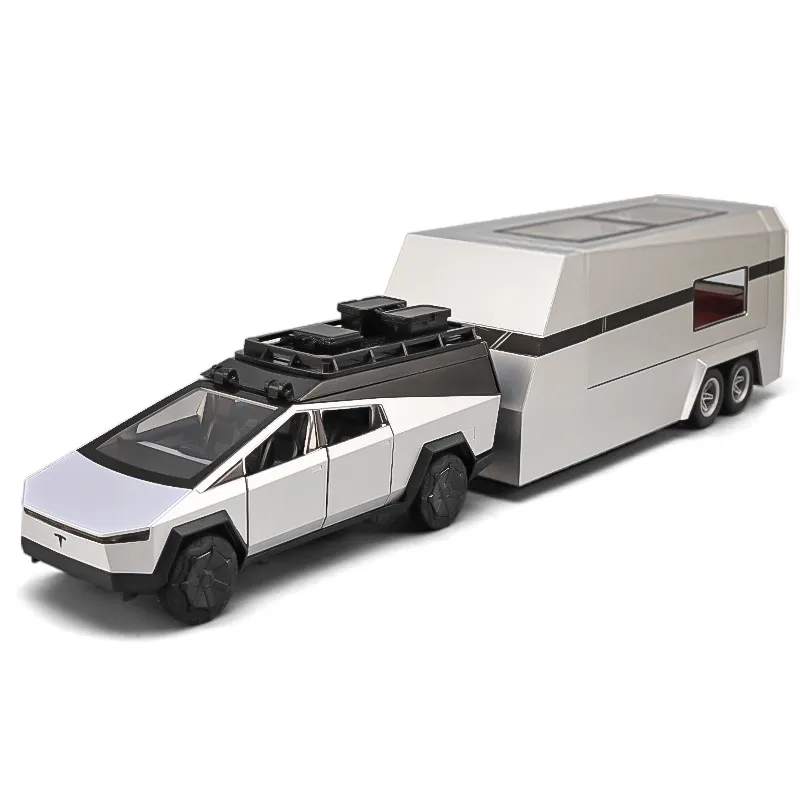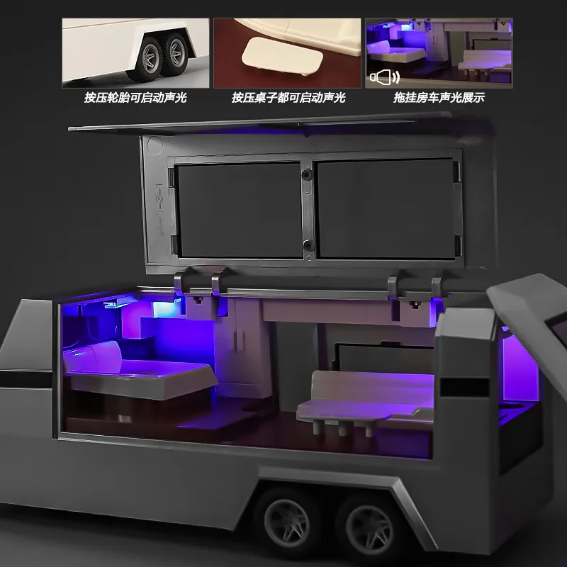 Explore the future of adventure with the 1:24 Tesla RV Alloy Toy Car — featuring a detachable motorcycle, pull-back action, and realistic sound and light effects!