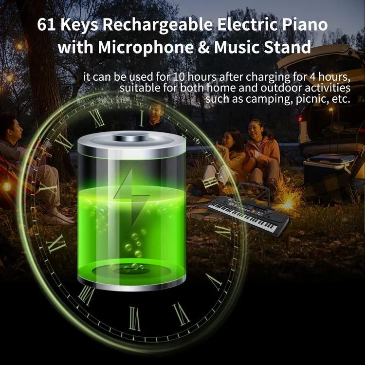 The keyboard includes a built-in rechargeable system, eliminating the hassle of frequent battery replacement. It also comes with a microphone, allowing kids to sing along while playing—making learning more interactive and enjoyable.