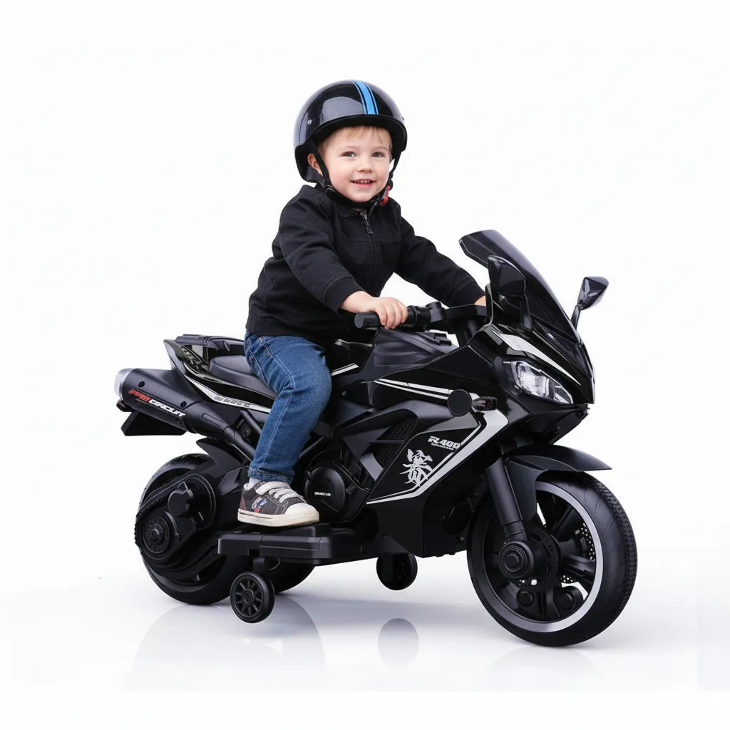 CE Unisex Kids Electric Ride-On Luxury Bike 400 – Battery Car with Music & LED Lights ( Black )