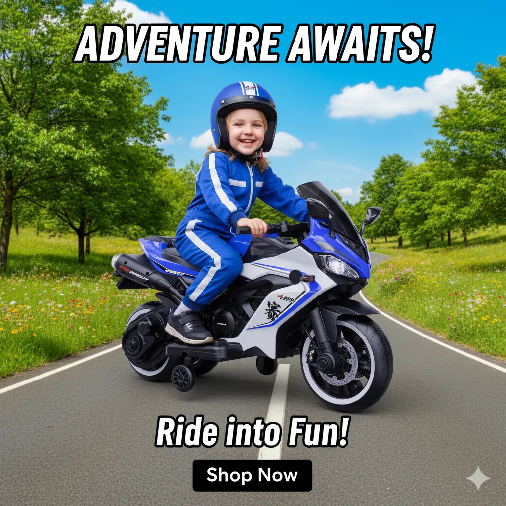 Stylish, safe & fun! The CE Ride-On Luxury Bike 400 lets kids enjoy a smooth electric ride with music, LED lights & realistic bike experience.