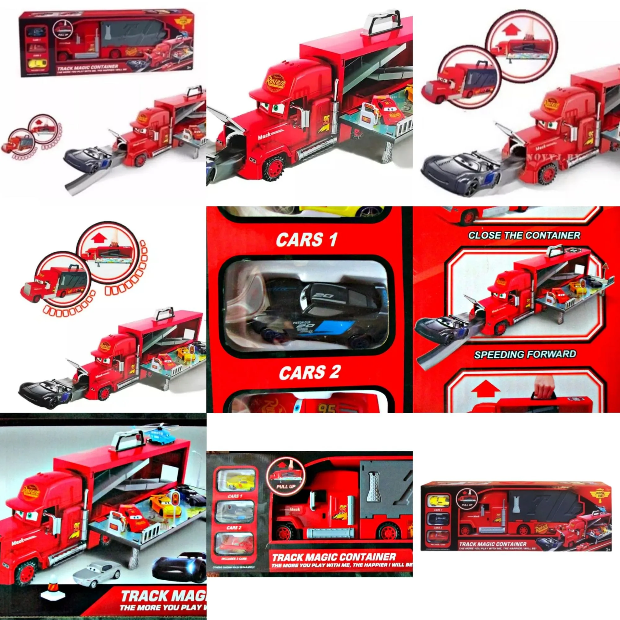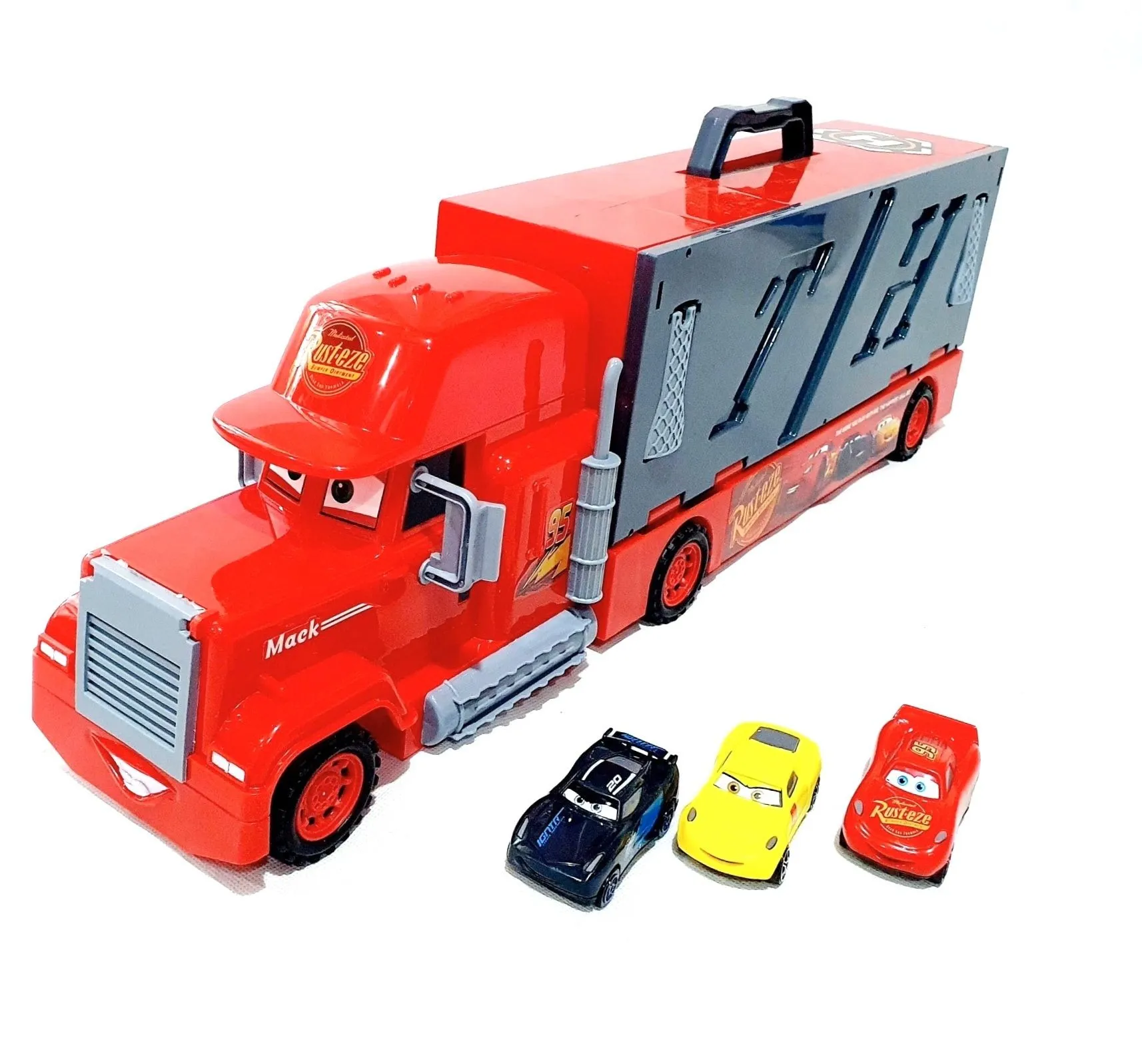 A large Mack-style truck with metal cars and a built-in parking playset—perfect for kids who love vehicle adventures and imaginative play!